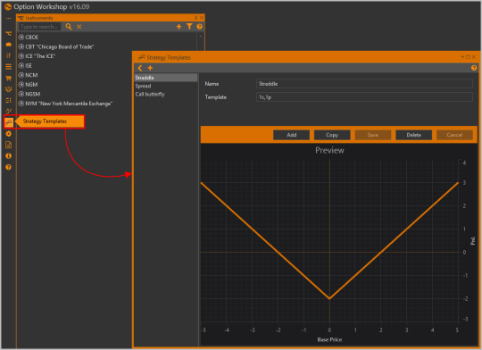 В Менеджере шаблонов можно создавать и изменять шаблоны. Для каждой опционной комбинации на форме выводится качественный график прибыль/убыток.