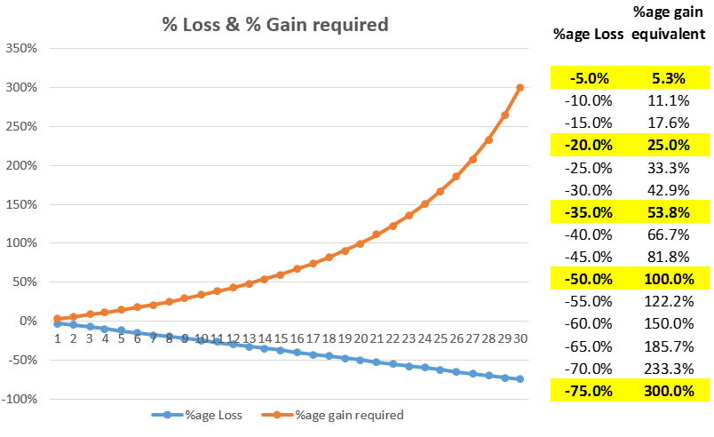 Prevention is also my number one goal because once you self-destruct, it will take much longer to gain back what you lost. Below, the orange line shows the corresponding gain you need to offset a particular loss (in blue).